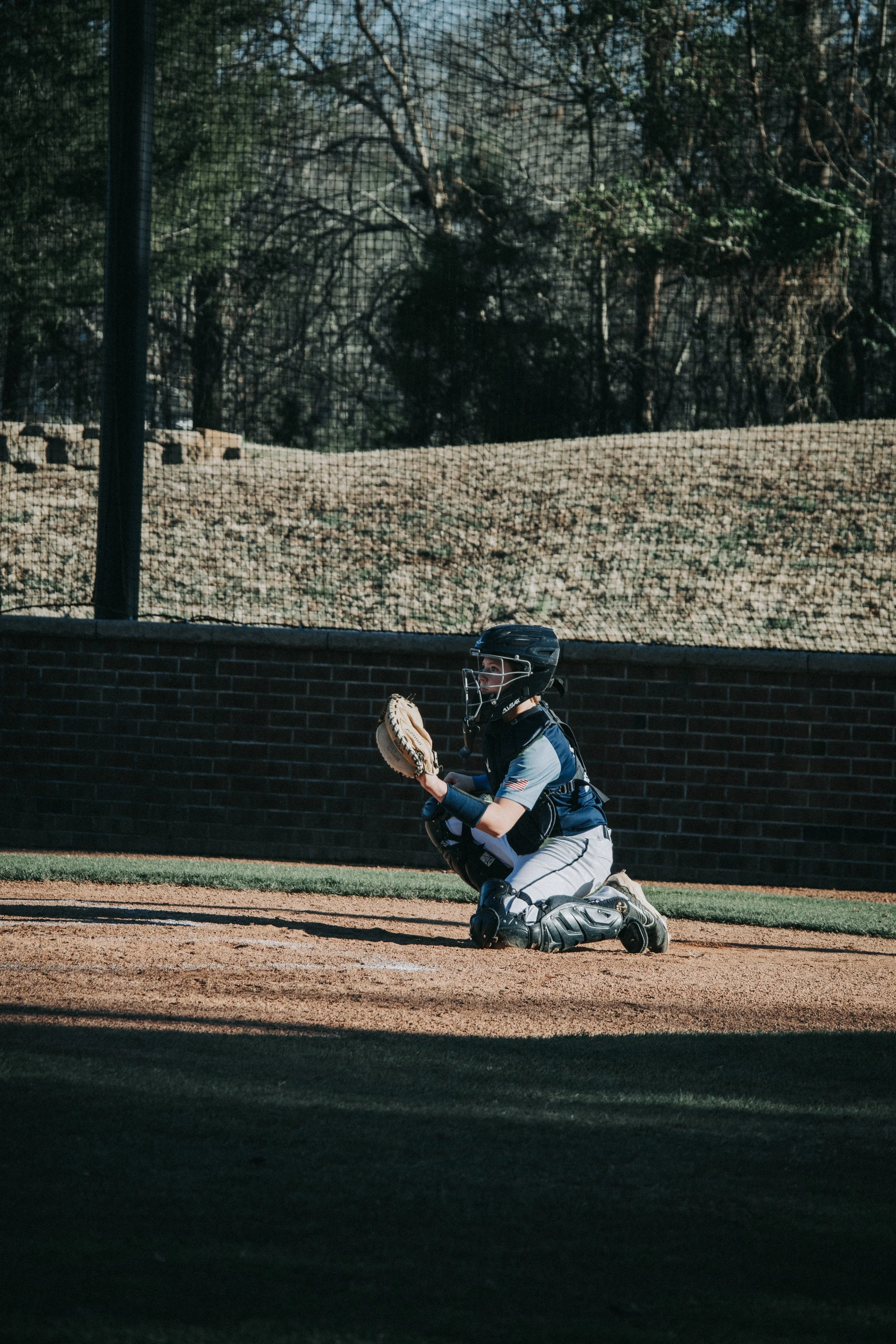 Baseball player catching a ball on a grassy field with a scoreboard in the background marked Latin and Charlotte Latin Hawks.