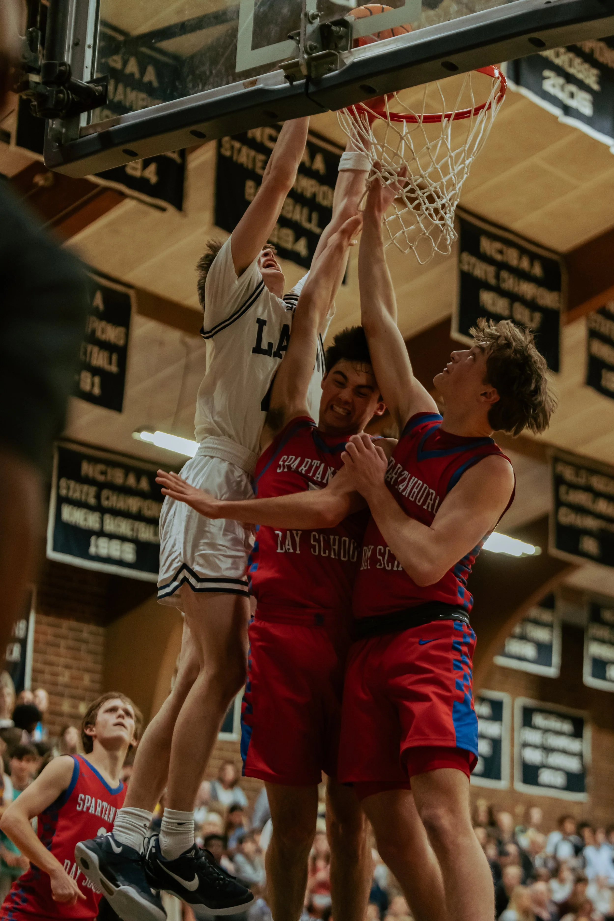 Two basketball players in a gym during a game, one dribbling the ball. A scoreboard shows Providence Day School Chargers vs Hawks with a score of 32-33.