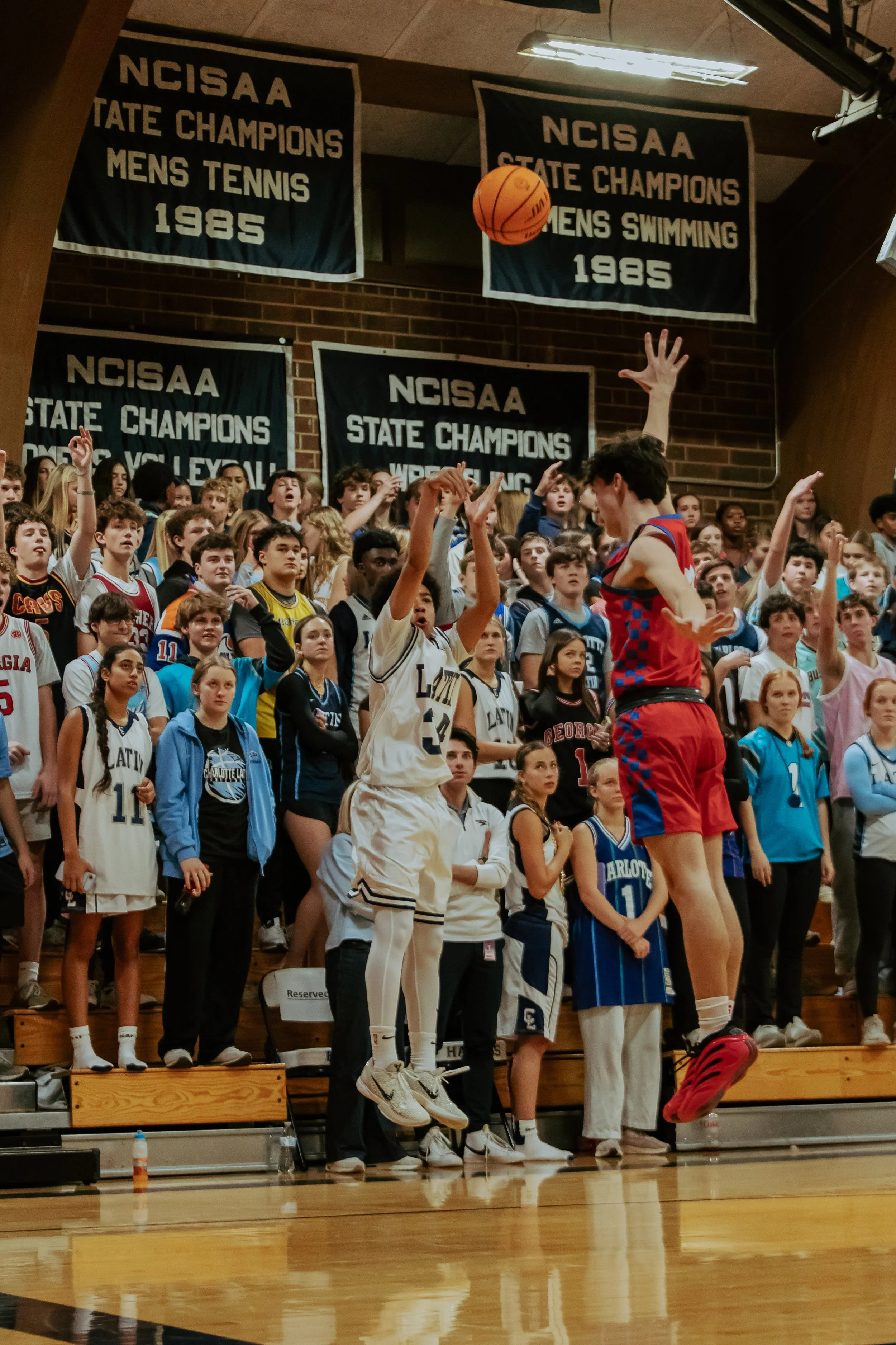 High school basketball player shooting a free throw in a gym with spectators and cheerleaders in the background.