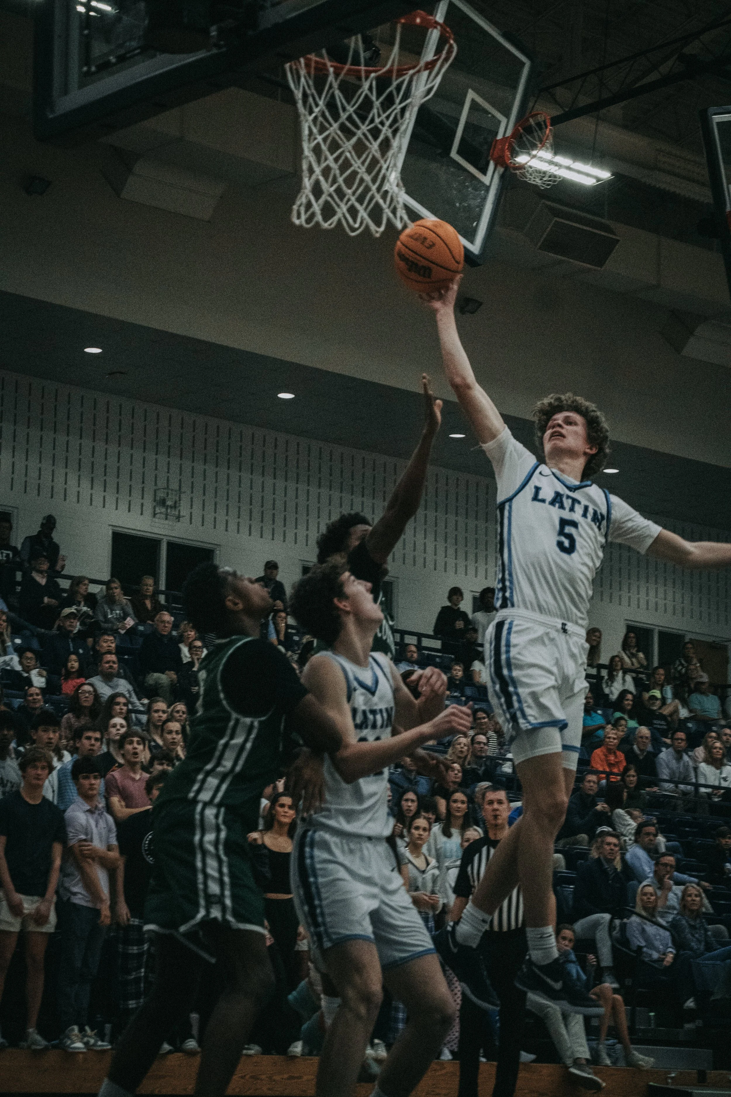 Basketball player wearing a "Latin" jersey with number 5 on a court, during a game in a gymnasium.